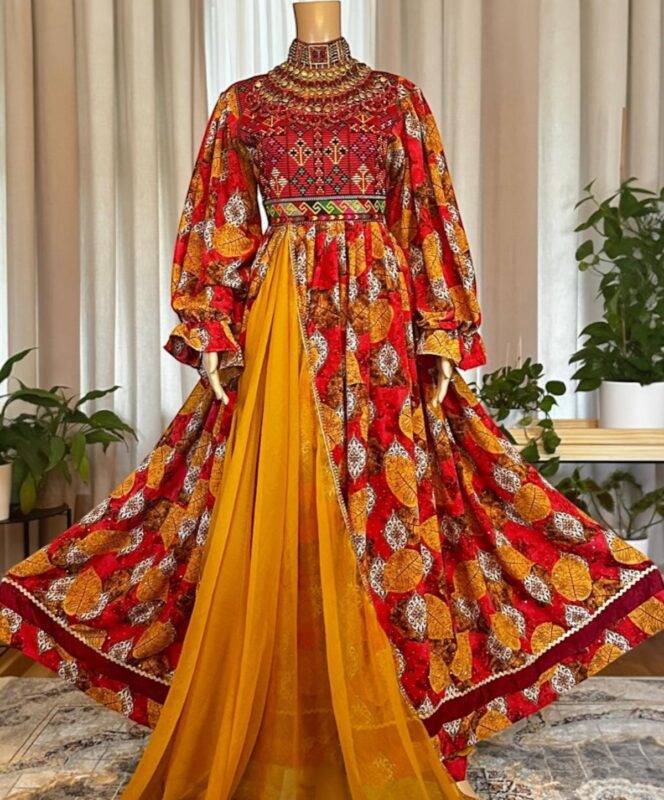 Long Shirchai Dress with Embroidered Yakhun and Burnt Yellow