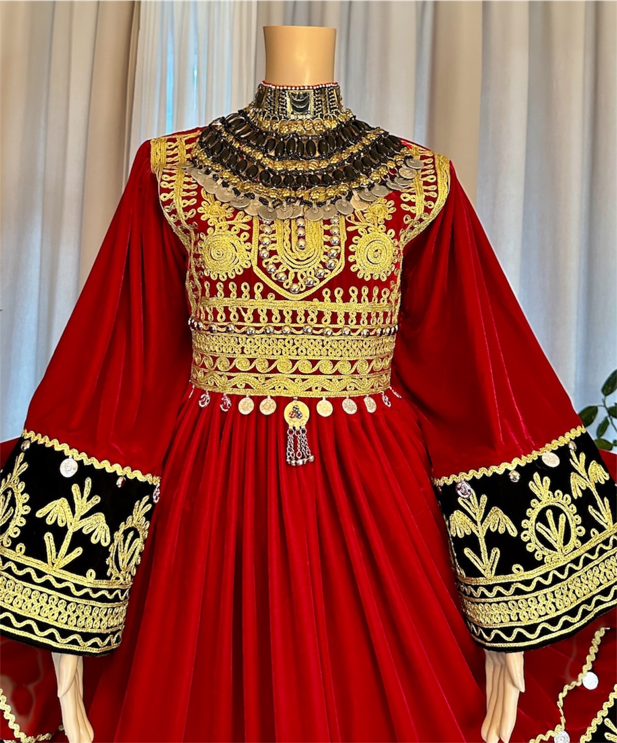 The Atash-e-Sorkh Afghan Traditional Dress is a bold expression of color, heritage, and refined Afghan craftsmanship. This outfit is made from premium Sorkh Makhmal, giving the dress a powerful and elegant presence.