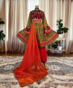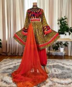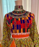 Product Name: Green & Orange Flared Dress with Embroidered Yakhun