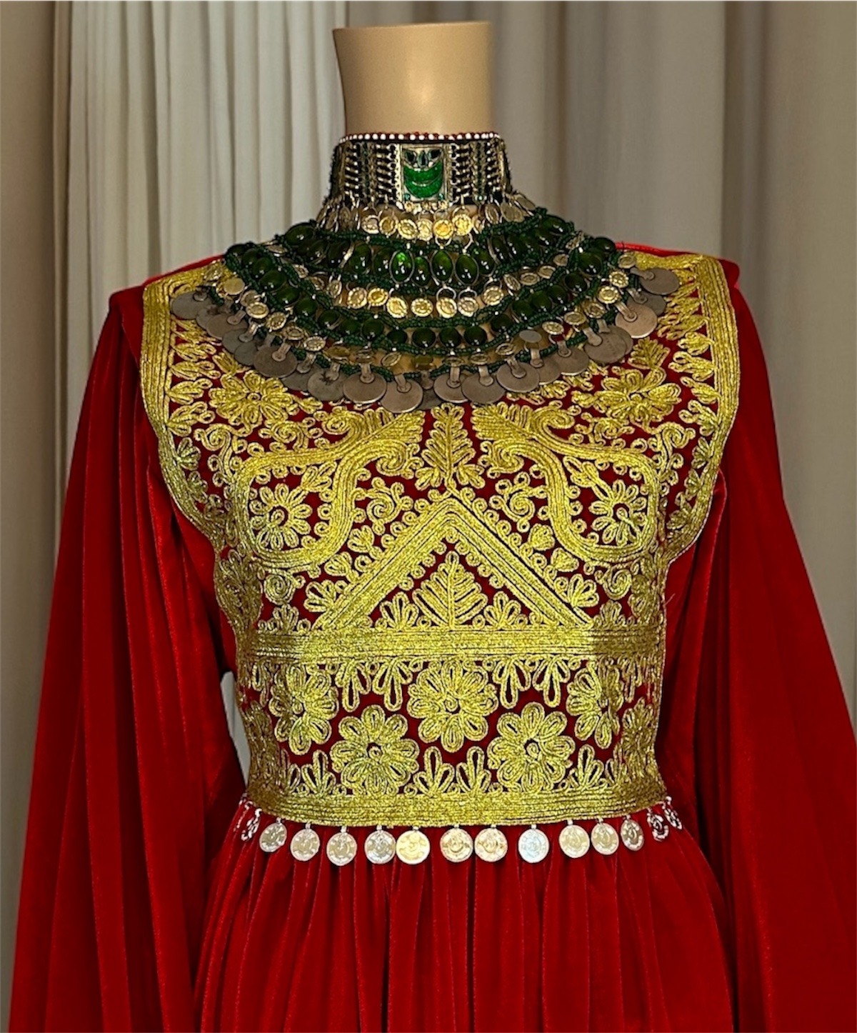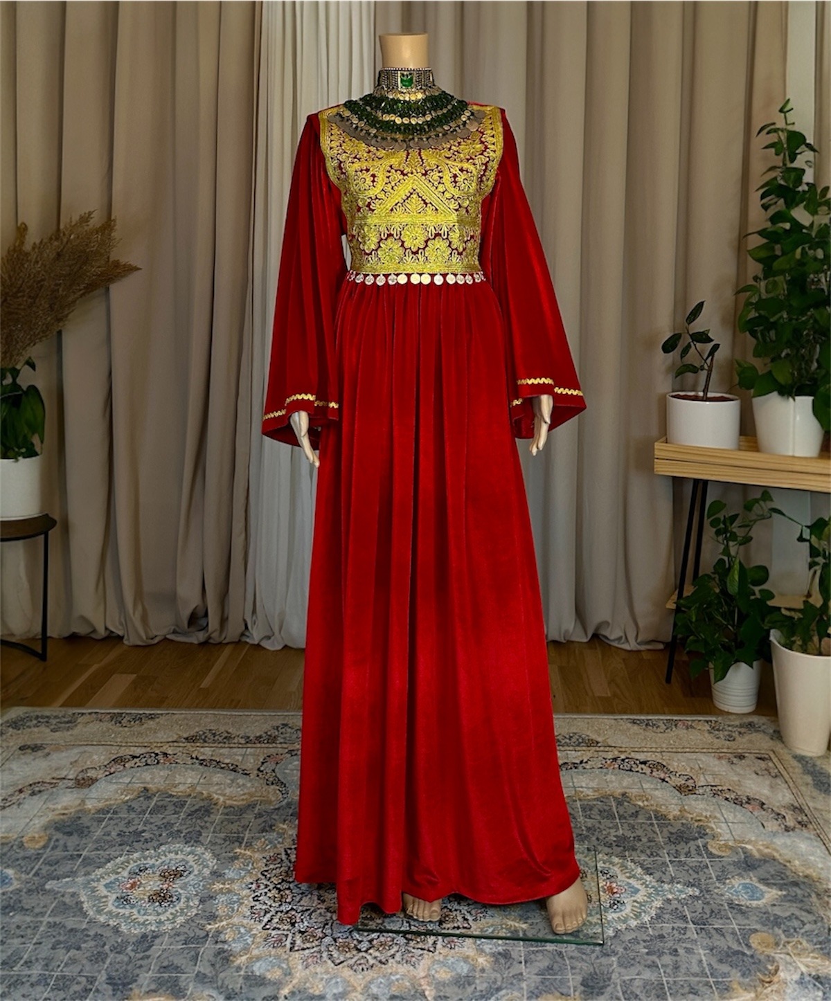 The Mehr-e-Sorkh Afghan Long Dress is a graceful and elegant design created for festive and formal occasions. This long dress, measuring approximately 147 cm, is made from high-quality stretchy Sorkh Makhmal, allowing comfortable wear while maintaining a beautiful flow.