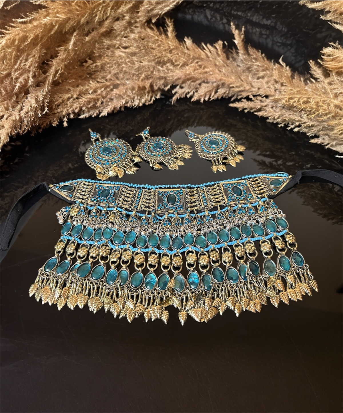 This set includes a statement necklace and matching earrings, designed specifically to complement Gand Afghan dresses, velvet outfits, and richly detailed traditional clothing. The turquoise color symbolizes calmness, heritage, and refined beauty, making this set an ideal choice for weddings, Eid celebrations, and cultural events.