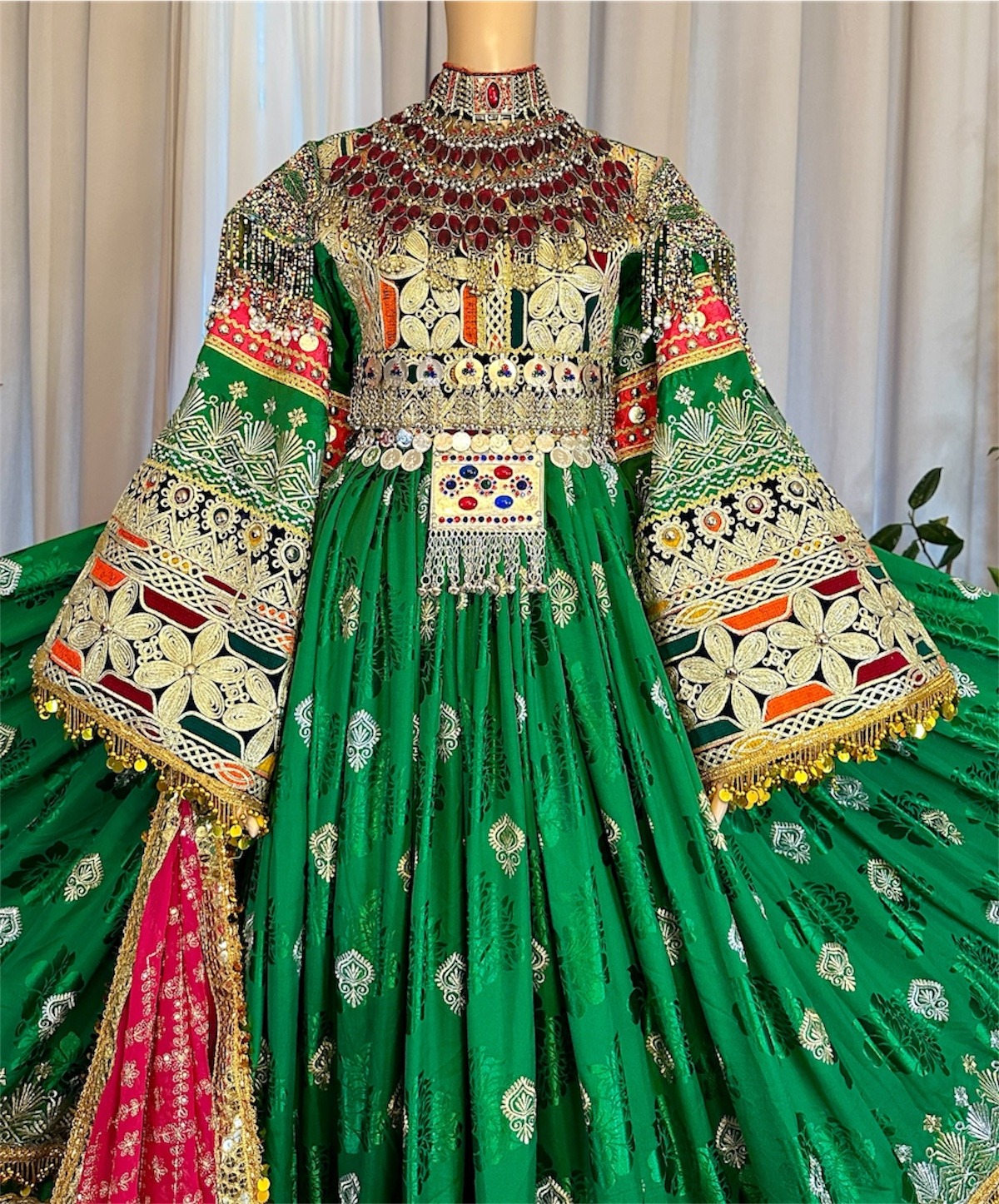 Zomorod Shahaneh is a luxurious and statement design from Rohjan Couture, featuring a light green color and rich decorative details. The neckline is beautifully adorned with charmadozi, sekedoozi, and intricate beadwork, while the shoulders are enhanced with elegant coin embellishments, creating a regal and refined look.